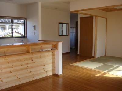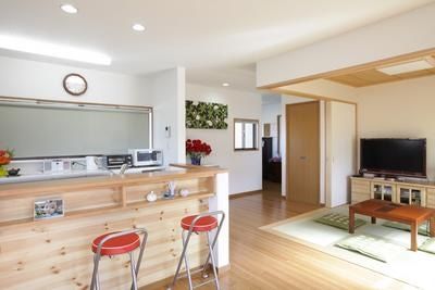 キッチンはダイニングに面した部分に収納も設けられ、ナチュラルテイストの温か味溢れるデザインです。シンクの前にカウンターが立ち上がっていますので、お客様から手元も見えず安心ですね。
