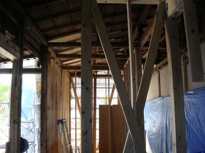 2階部分が取り除かれスッキリしました。解体した部分の鉄骨は足元が錆びていて荷重を支えるに充分な耐力があるとは言えない状態でした。木造平屋の上に鉄骨で2階を増築した建物でしたので、今回の減築は建物全体にとっても適切な判断だったと言えます。増築は急に迫って行っているケースが多く、今回のように建物全体の事を考えていたとは言いにくい場合も少なくありません。