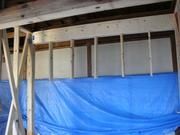 写真1 壁に耐震補強として筋交いを施工。東西と南北方向にバランスよく耐力壁が配置されているかをプランの段階で確認し、必要な量を計算。シングルまたはダブルの筋交いを使い分けます。端部は金物で補強します。
