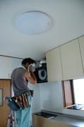 現場では、電気屋さんが汗をフキフキ、そのシロッコファンを取り付けています。