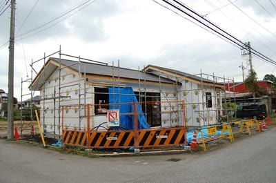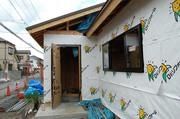 しっかりとした基礎と土台ができあがると、しばらくは大工さんの工事が続きます。外壁に貼って行く透湿シート(雨はシャットアウトするが湿気は逃がす)には、ドクターリフォームサンセイのマスコットマーク『ばななくん』たちがプリントされていますね。なぜバナナかですって?それは「古くなって泣いていたオウチがリフォームでひと皮むけてピカピカニコニコになりました。」と状態を表しているからなのです。