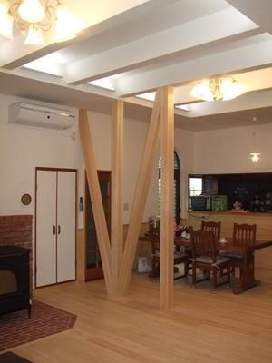大きなV字の筋違いがリビングの中央にどっしりと配置され、無垢材をふんだんに使用したLDKが完成しました。