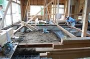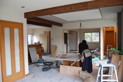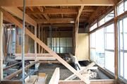 大きな空間を造るために柱を撤去し梁の補強が完了しました。外壁も貼られ工事は順調に仕上げに入ります。