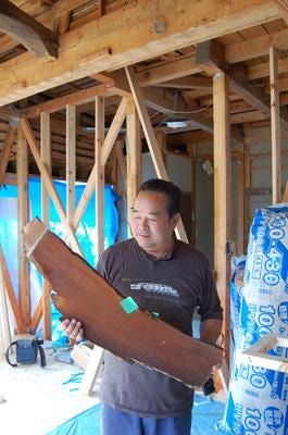 くまさんが鮭をとって来ました。いえいえ大工さんが古材を手にしています。リフォームが完成した際に喜ばれるのが『解体前の材料を活かして何かを造ること』です。今回はどんなアイディアが棟梁の技から生まれるのでしょうか?