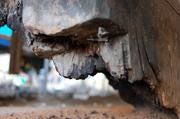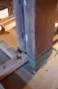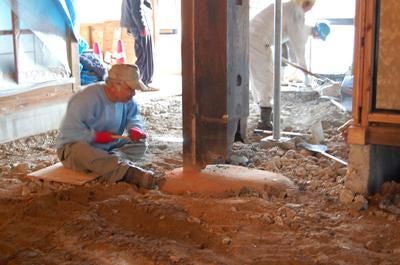 床を剥がしてみると大黒柱の根本はご覧のように朽ち果てていました。建物の重みを支える上で最も重要なこの柱をこのままにして工事を先に進めるわけにはいきません。丁寧に処置を施しより強い建物になるよう施工していきます。