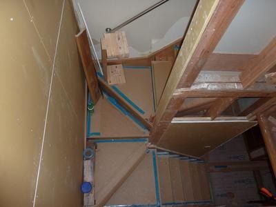 新築時から納まりが気になっていた階段を「リフォーム階段」でカバー工法で納めることにしました。階段の踏面も寸法が階段によって違う部分も下地で調整し上貼しました。