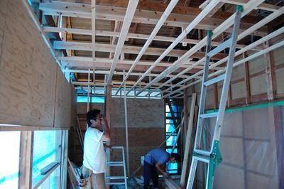 内部解体工事も完了し、木工事が始まりました。構造の補強をし天井野縁下地組中です。
