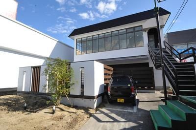 正面のファサードは黒の塗り壁に大谷石と無垢板の組み合わせ。
