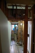 リフォーム部分も水廻りの工事が進んでいます。システムバスも設置完了、洗面脱衣室の床、壁の石膏ボードを貼り仕上げ工事と進みます。