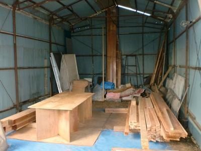 庭先の倉庫をお借りして、増築部分の材木の「キザミ」をしております。雨の日もこれで安心して作業に専念出来ますね!