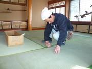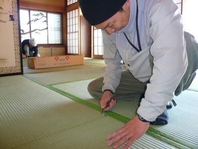 畳表・縁を張替え納めに来てもらいました。入念に敷居の取合いや畳の合せを調整してくれています。い草の良い香りがして気持ちがいいです。
