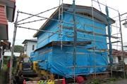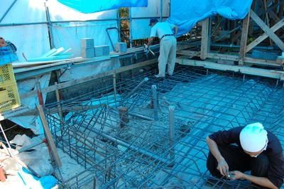 ぐるりとブルーのシートで覆われた建物内では、基礎の鉄筋が組まれています。お隣に仮住まいをして頂いてるご主人にお話を伺ってみると「この家は基礎が心配だったからこれで安心だ」と胸をなでおろして頂いている様子。