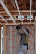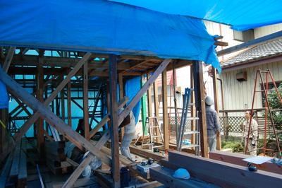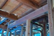 基礎が完成すると大工工事。間取りの変更がある部分の柱を入れ替えると同時に、大きな梁を入れ補強をしていきます。
