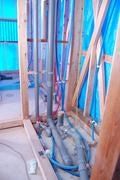 基礎が完成すると大工工事。間取りの変更がある部分の柱を入れ替えると同時に、大きな梁を入れ補強をしていきます。