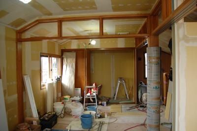 大工工事では、各部屋の断熱性を高めるための断熱材やインナーサッシ取り付け、間仕切りと明り取り窓を設置し、内装仕上げ工事へとつないでいきます。
