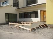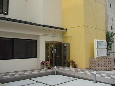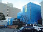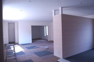 内装仕上げ工事もほぼ完了し、外部足場も解体されました。床にはタイルカーペットを色違いにランダムに配置し、デザイン良く仕上がりました。また、外壁もコンクリート打放しから、白に一新。かなり雰囲気も変わりました。これから外構工事の開始です。