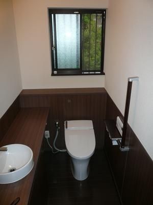 腰壁にはお手入れがしやすいアイカセラール不燃化粧板(木目)を貼り手洗いカウンターは造作家具で製作し高級感があります。
