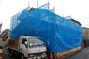 解体工事・基礎工事が終わり木工事が始まりました。外部はシートで養生し雨・風から宝物を守ります。
