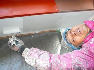 今日は塗装屋さんの野口さんが軒天井を真っ白に仕上げています。内部工事大工さんはいよいよ最終段階です。以前床の間に使っていた束柱をニッチのカウンターに使用しました。対面キッチンのカウンターも鉄骨屋さんに作ってもらったLアングルでしっかり補強しました。