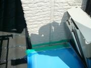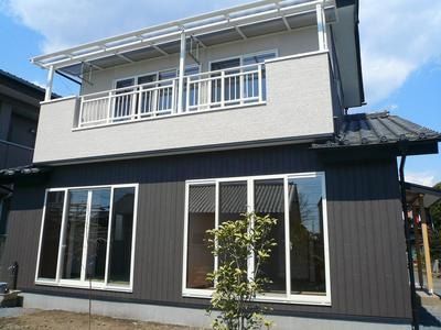 外壁サイディングも仕上りベランダにテラス屋根を取付中です。外壁と笠木の取合いもしっかり防水シーリング作業を行います。
