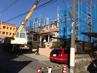 住宅の為、警察署に申請をし、道路を通行止めにしてクレーンを使い工事を進めていきます。