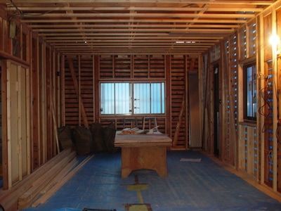 1階部分は既存の骨組み再利用なので水平垂直に床と壁を直しました。