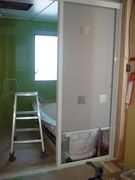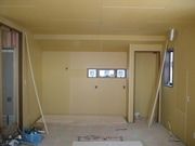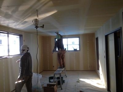 写真はボードの継ぎ目をパテ処理にて平らにし、さらにそのパテを削り上げているところです。