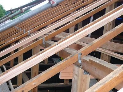 屋根小屋裏の母屋束交換や補強金物が取り付けられました。既存野地板を撤去し野地合板を張っていきます。棟部はルーフィングの増し張りを行い、万全を期しています。