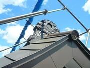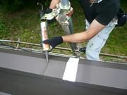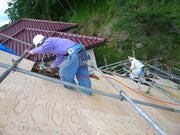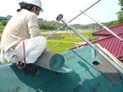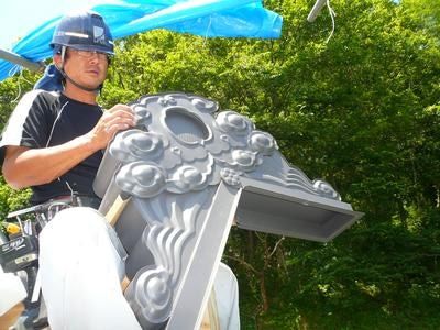 棟に取り付ける鬼ですが近くで見ると大きいですね~!抱えてる職人さんも一層男らしく見えますね。棟の笠木は捨てシーリング作業を行い雨水の浸入を防ぎます。