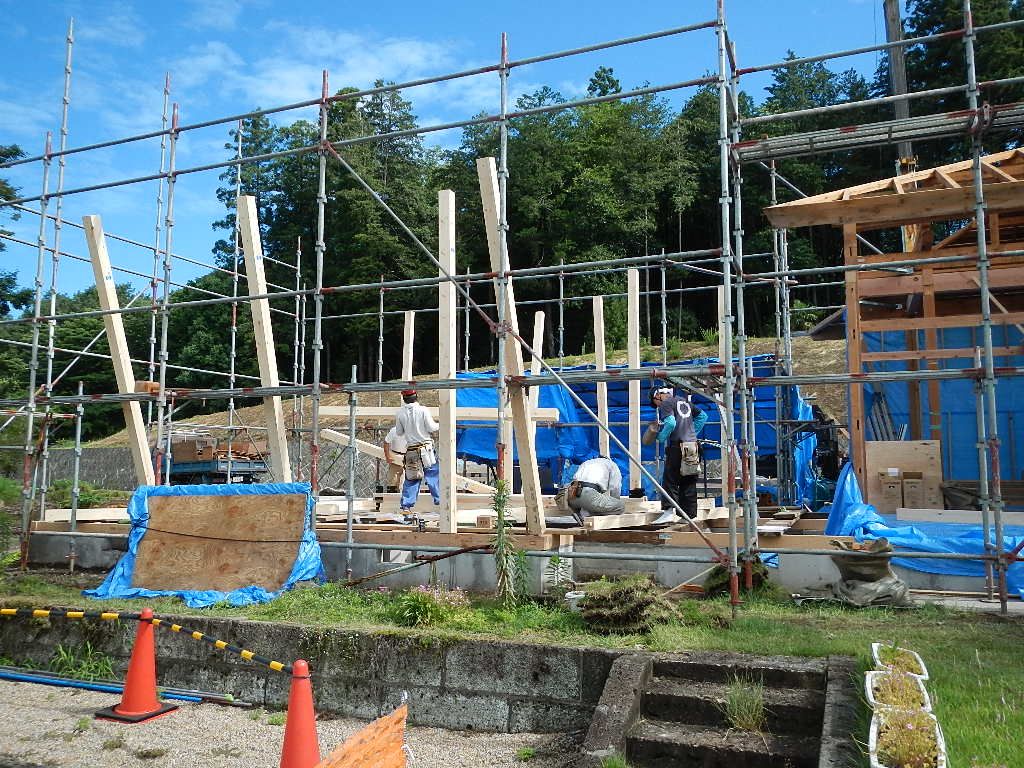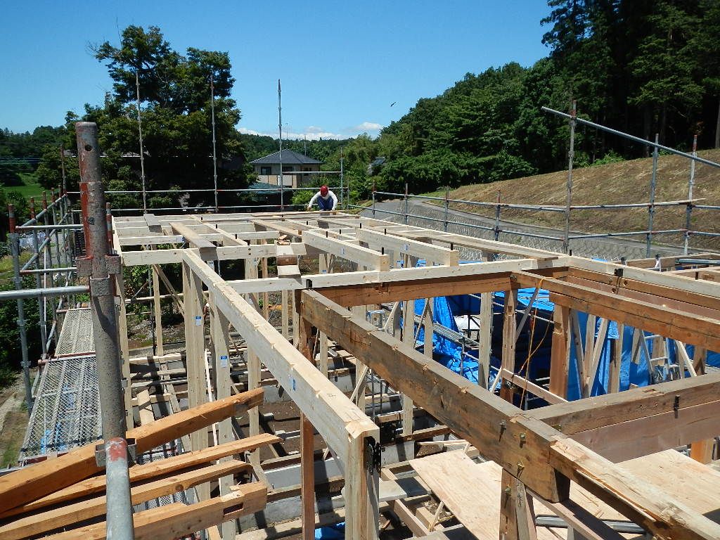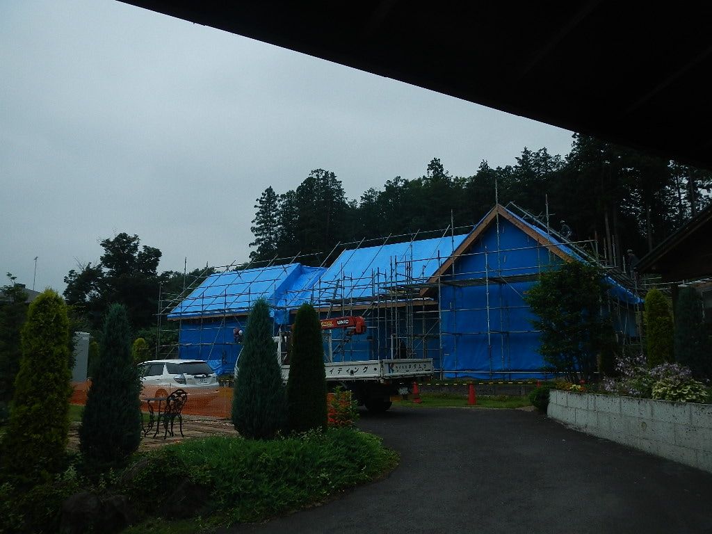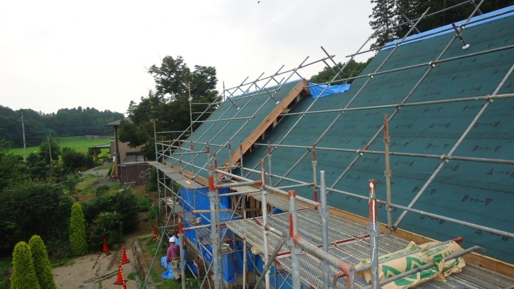 既存の小屋組みを解体しながら、新しい9寸勾配の屋根を作っていきます。雨で濡らさないために日にちはあまりかけれません。最後はブルーシートで養生です。