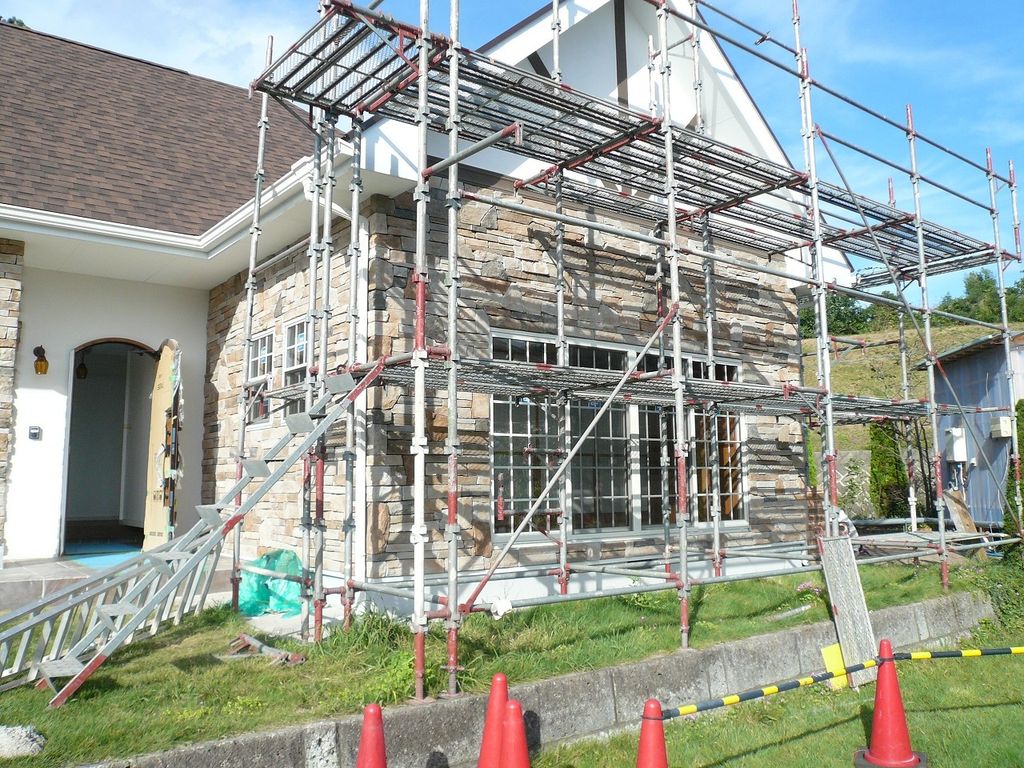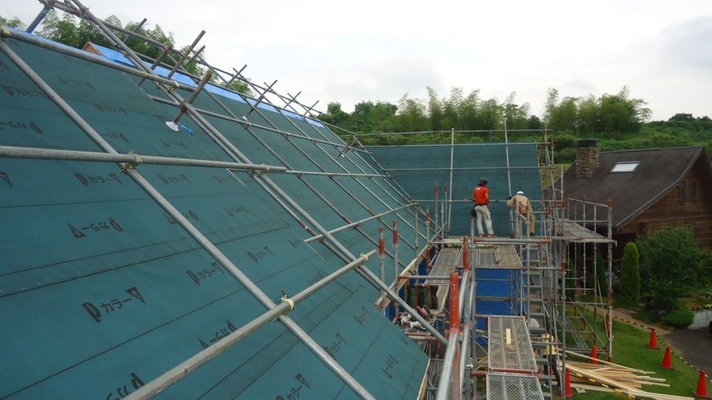9寸勾配というと写真でもわかるようにかなりの急勾配。実際に上がってみるとまるで壁のようで立っていられません。そのために、作業用の屋根足場というものを設置します。屋根の仕上げはシングル葺きというものです。