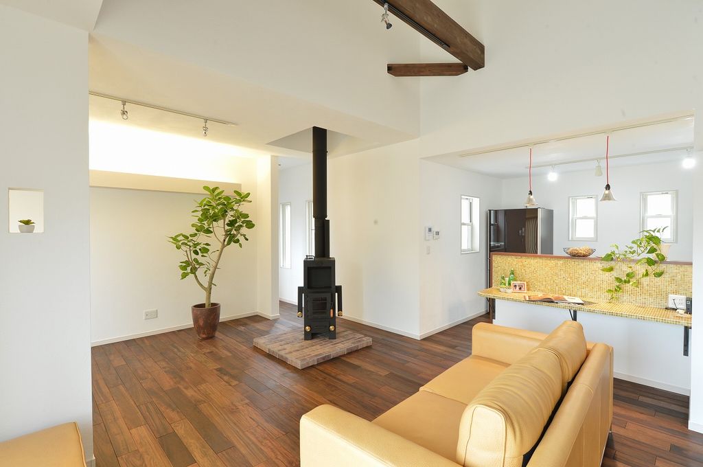 内部の天井・壁は漆喰、床はウォールナットの無垢材で仕上げました。またリビングには薪ストーブ(ペレット兼用)が設置されました。