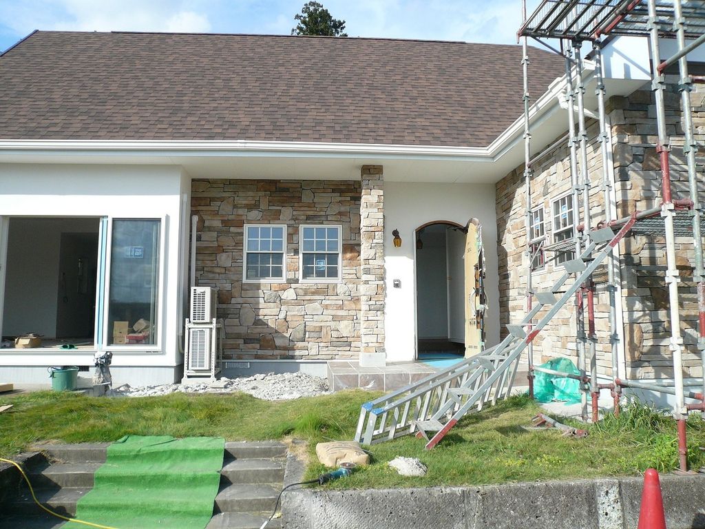 屋根のシングル葺きもきれいに仕上がり、外壁は塗り壁(AICA ジョリパット)、玄関周りは米国産天然石を張りました。