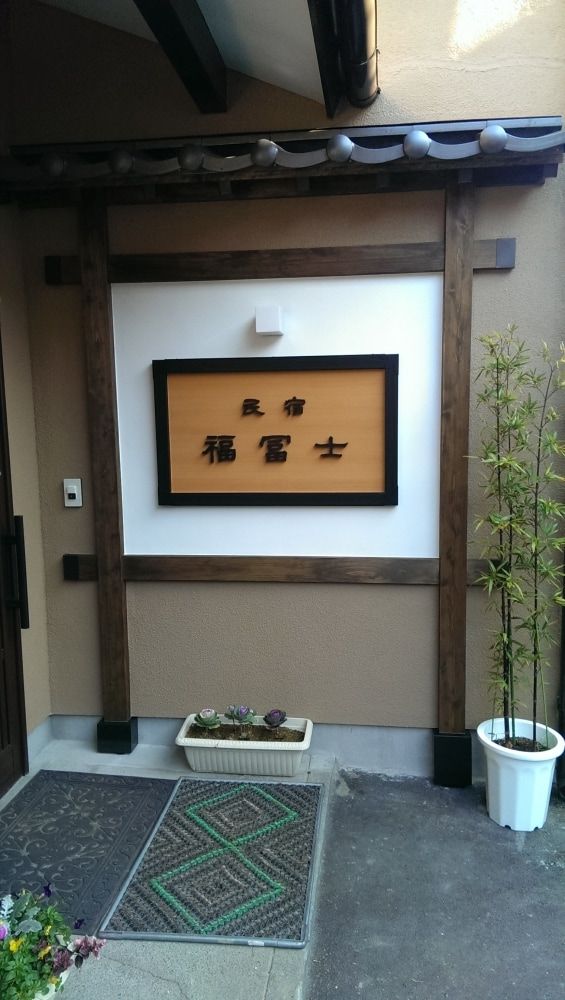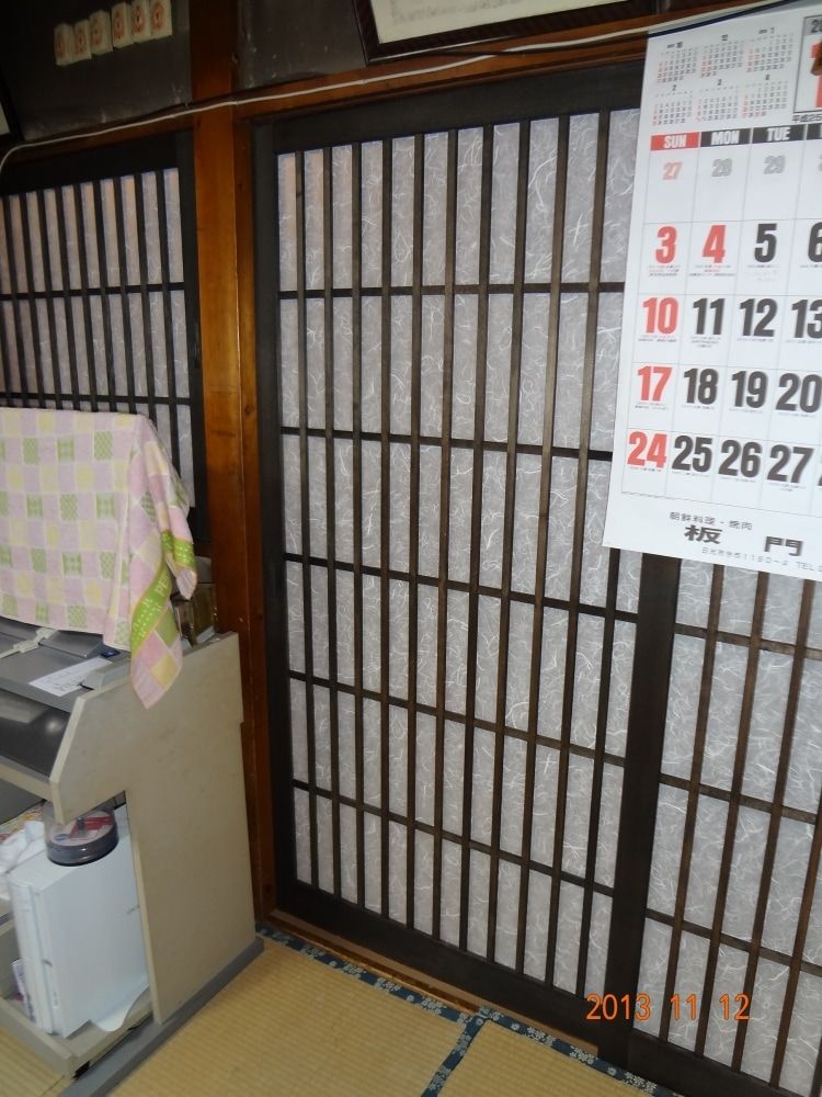 民宿のメイン工事は内外装のリニューアル 受付の建具は「格子」を入れたシンプルな古民家風。障子の代わりにアクリルの障子「ワーロンプレート」を入れた建具に交換しました。