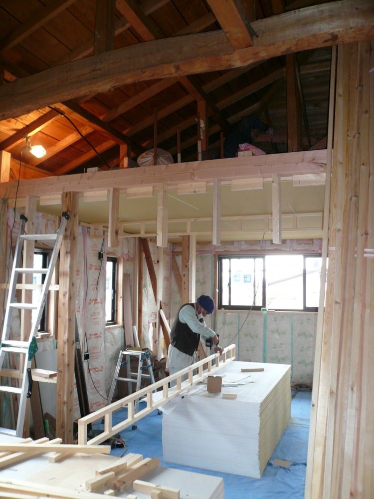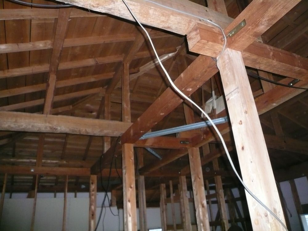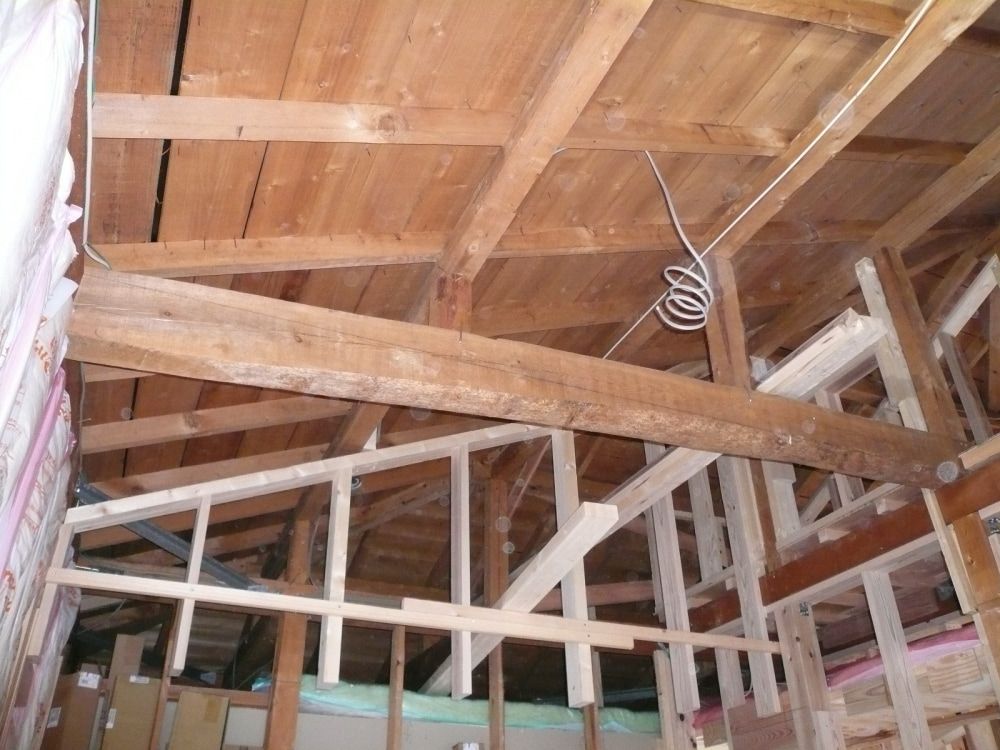 内部は勾配天井の部屋を2室天井下地造作中です。
