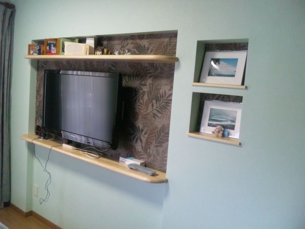 ハワイを思い浮かべられるような南国風クロスや、壁面に取り付けられたテレビが邪魔にならないように壁を凹ませたり、ご夫婦のアイデアがいっぱいです。