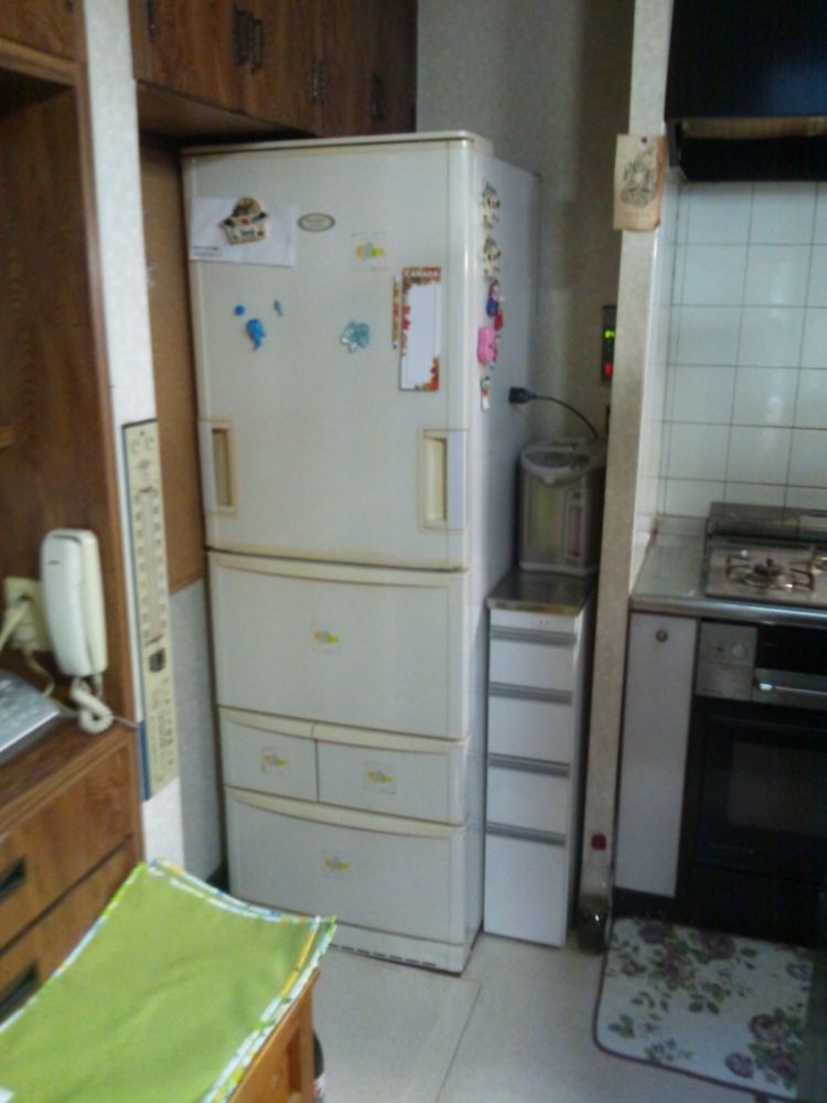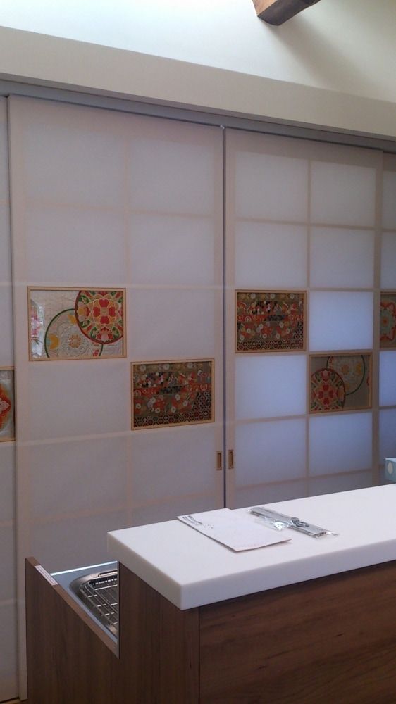 キッチン背面の家電収納を隠す建具には、奥様が成人の時にしめていた着物の帯をデザイン的に使用しました。