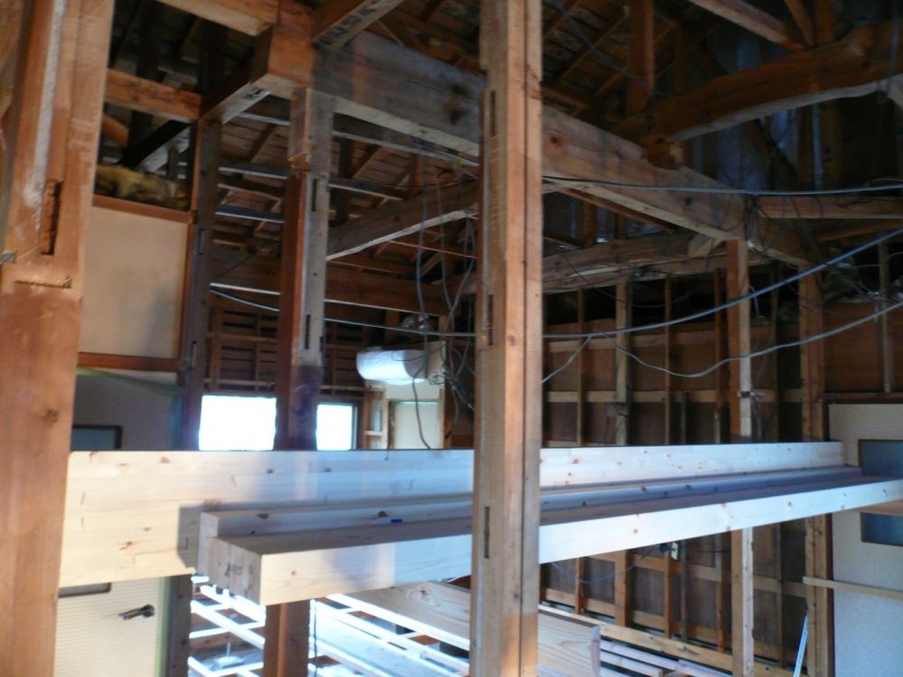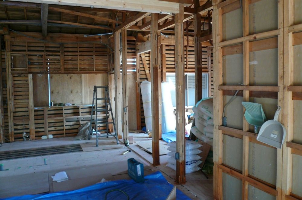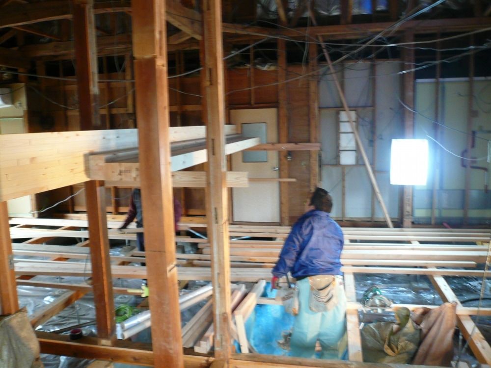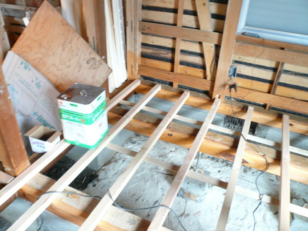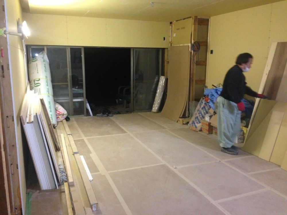 解体工事も順調に(少し遅れ気味)進み、 現在木工事進行中!床の下地からの造作になります。床下の調湿材も敷き込みながら床根太+断熱材+針葉樹合板貼りをしフローリング貼りになります。