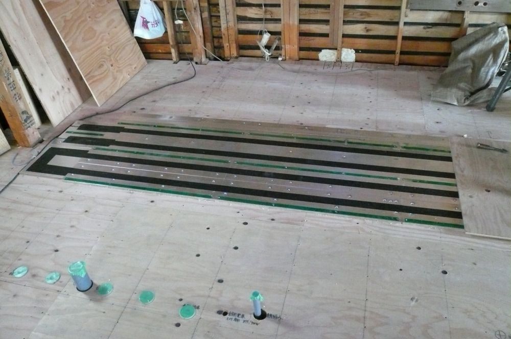 梁補強をして、柱抜きも進行しています。床の下地も完了し温水式の床暖房のパネル敷き込みをしました。対面のキッチンの足元とダイニング、リビングに設置しました。水道の給水・排水の配管工事も進行中!