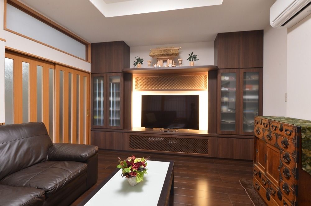 ご覧のように欄間も間接照明と一緒にデザインされ、洋服など荷物でごった返していたお部屋がお客様をもてなす空間に生まれ変わりました。新婚息子さんご夫婦が入る2階は、ガラッとイメージを変えシンプルなマンション風インテリアで統一。