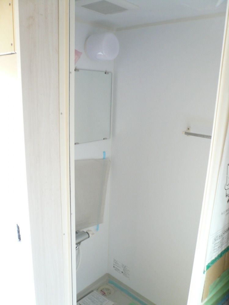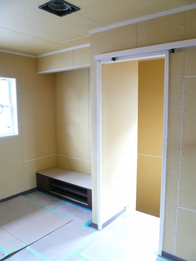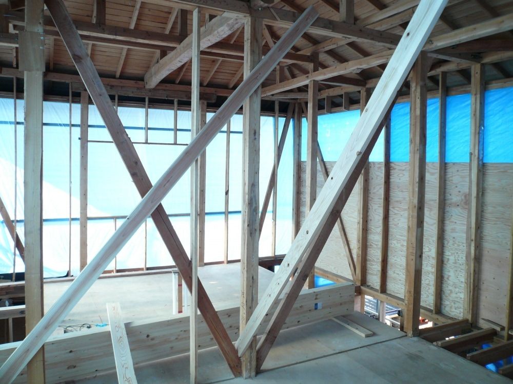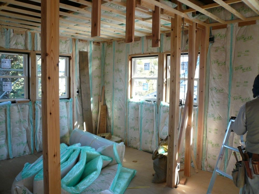 内部も間仕切りが進み電気配線工事・水道配管工事も並行して進んでいます。外壁周りには断熱材を入れてます。
