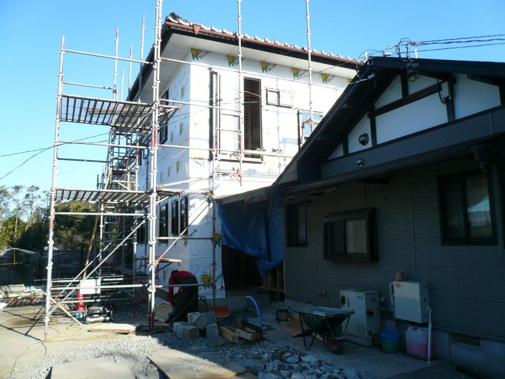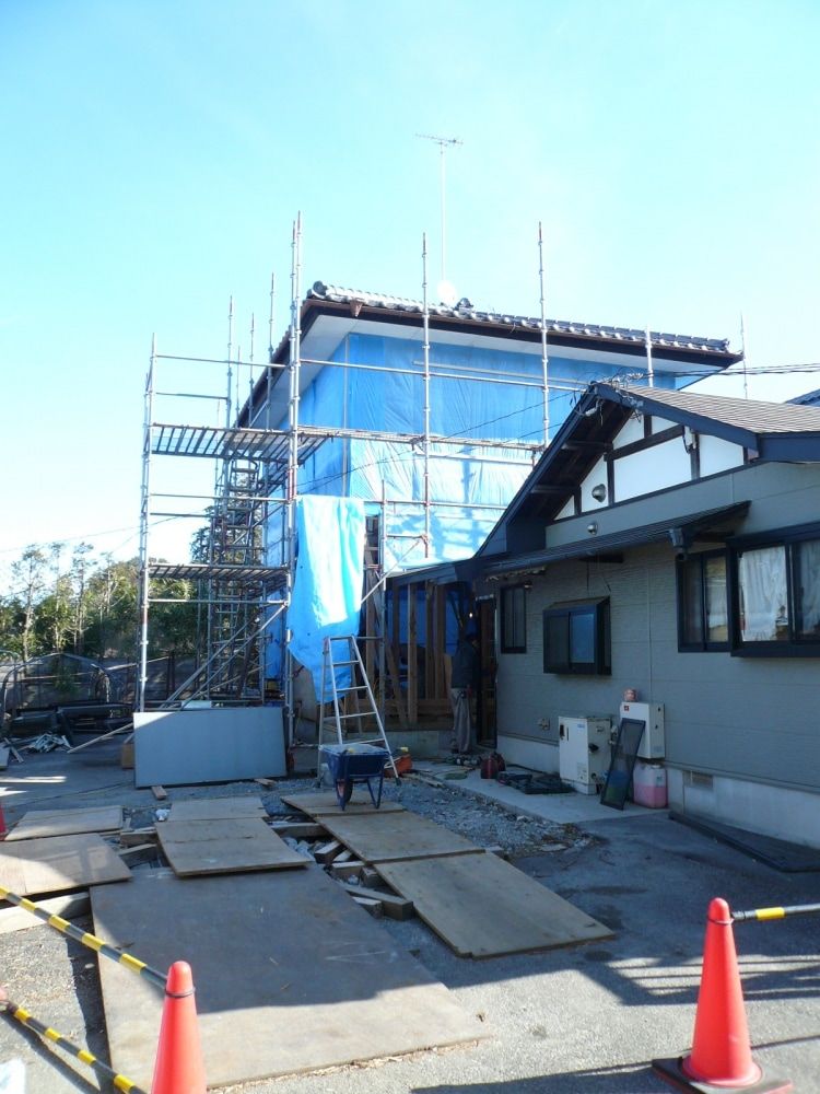外部はブルーの養生シートで囲まれていますが、日当たりの良い2階は温かく明るいです。 新しい間取りは2階がリビングなりますので快適になりそうです。