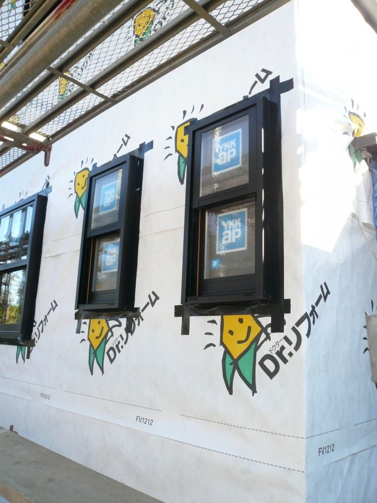 木工事進行中! サッシも取付完了、外壁下地の透湿シートも張りサッシとの取り合い部分は防水テープ(黒色)を四方に貼ります。横が先に縦が後貼りになります。