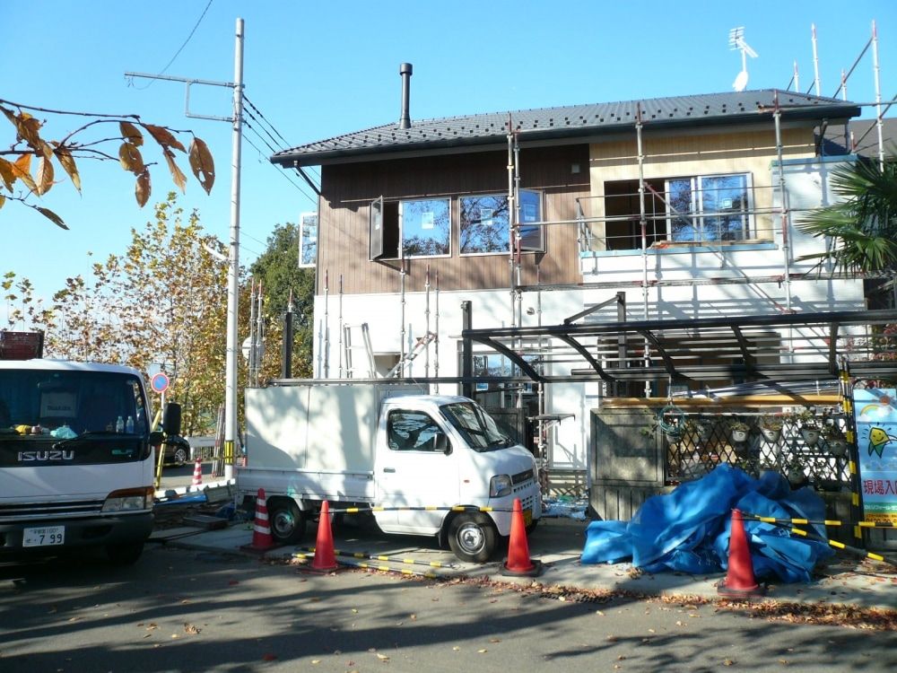 外壁や雨樋、ベランダの手摺りやアンテナも取付完了し、足場を撤去しました。外部は給湯器の取付や玄関やアプローチのタイル貼り仕上げに入ります。