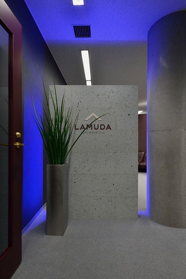 エントランスのドアを開けると、県産材の大谷石のサインがお出迎え!自立したそのシンプルな佇まいと、素材そのものの美しさは、身体を鍛えあげた人の美しさと通ずるものがありますね。こちらも中に照明を埋め込みアクセントとさせて頂きました。