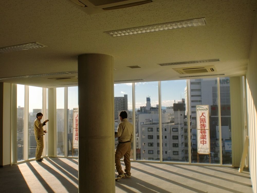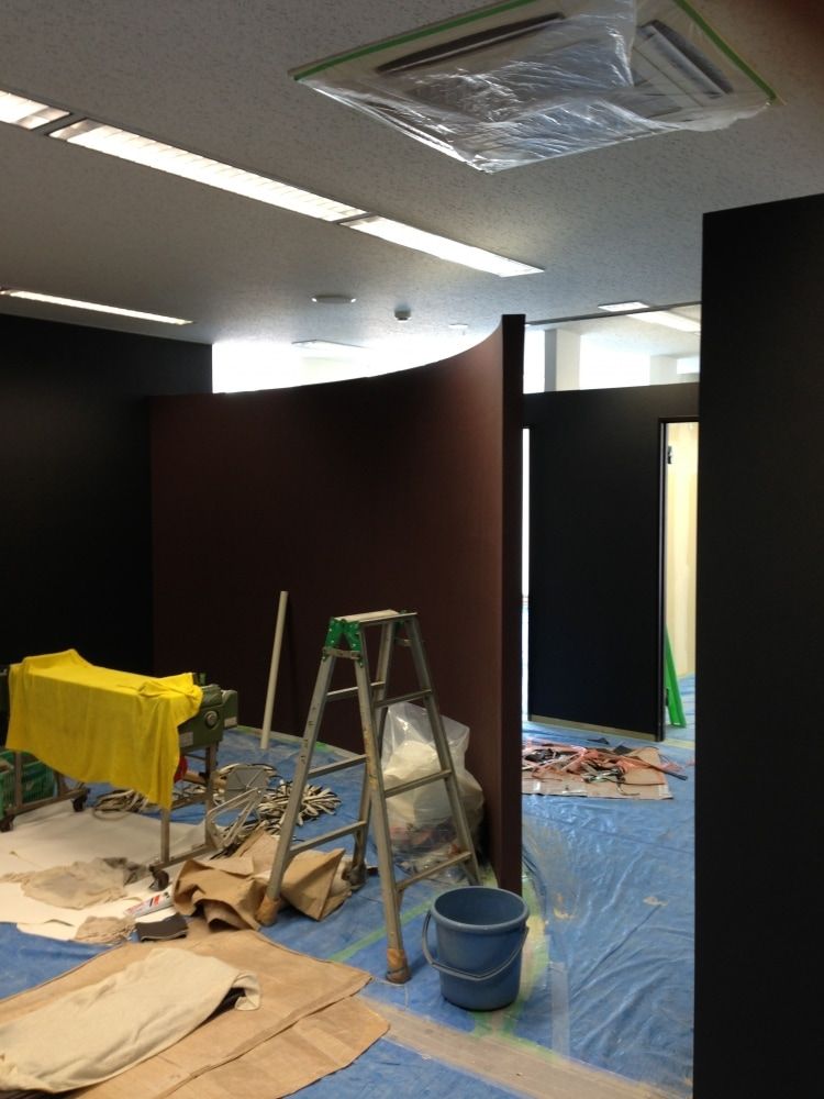 大きなテナントスペースの中心に、まるで大胸筋のような美しい曲線のR壁が立ち、それを際立たせる真っ黒な壁面が仕上がりました。クロスを張り上げ皆でうっとり。。。