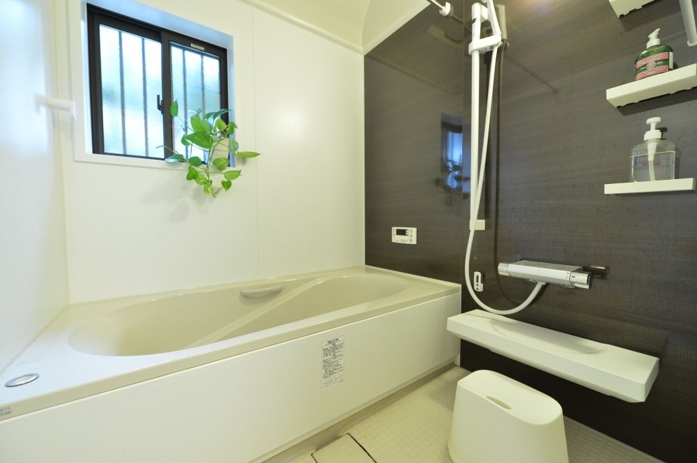 奥様ご趣味のトールペイントや多肉植物、こだわりの雑貨をディスプレイするのが楽しくなりそう。ご主人様は足をゆったり伸ばし快適なバスタイムを。