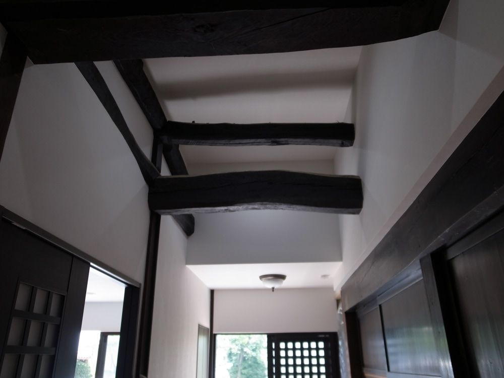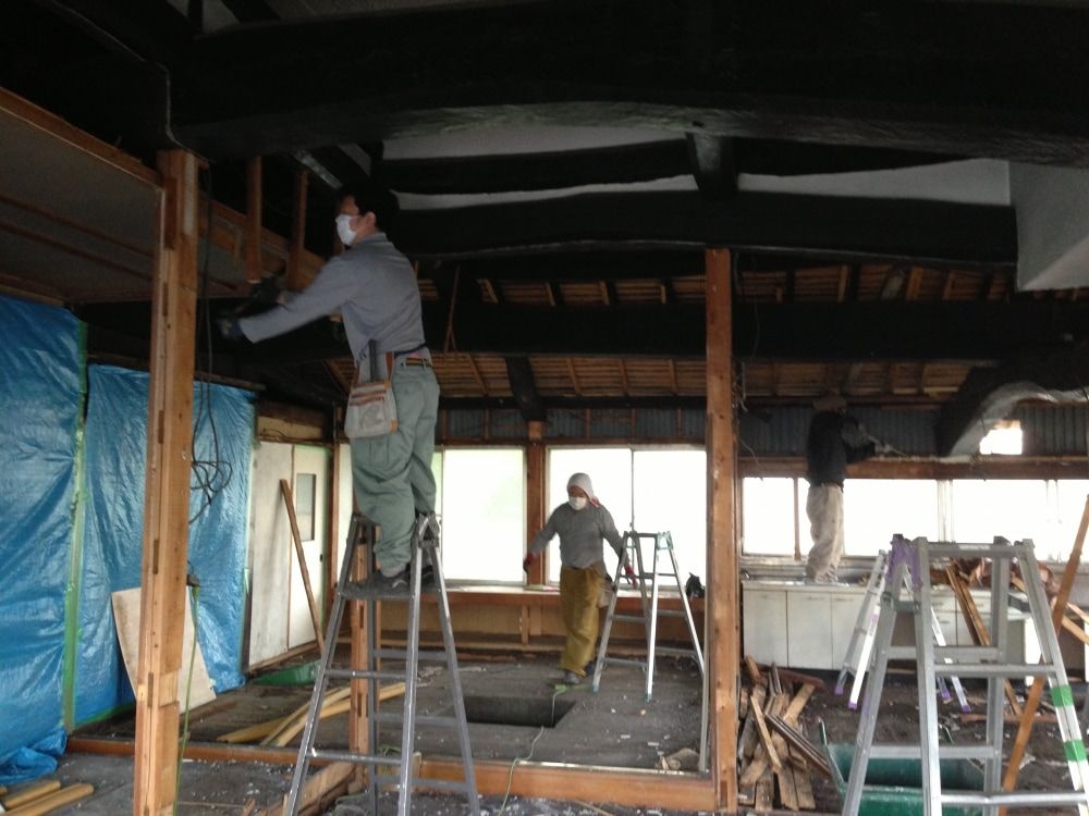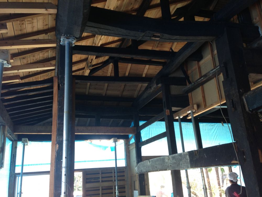 解体スタートです。天井を落とすと、そこには見事な黒く立派な梁材がお目見え!!!