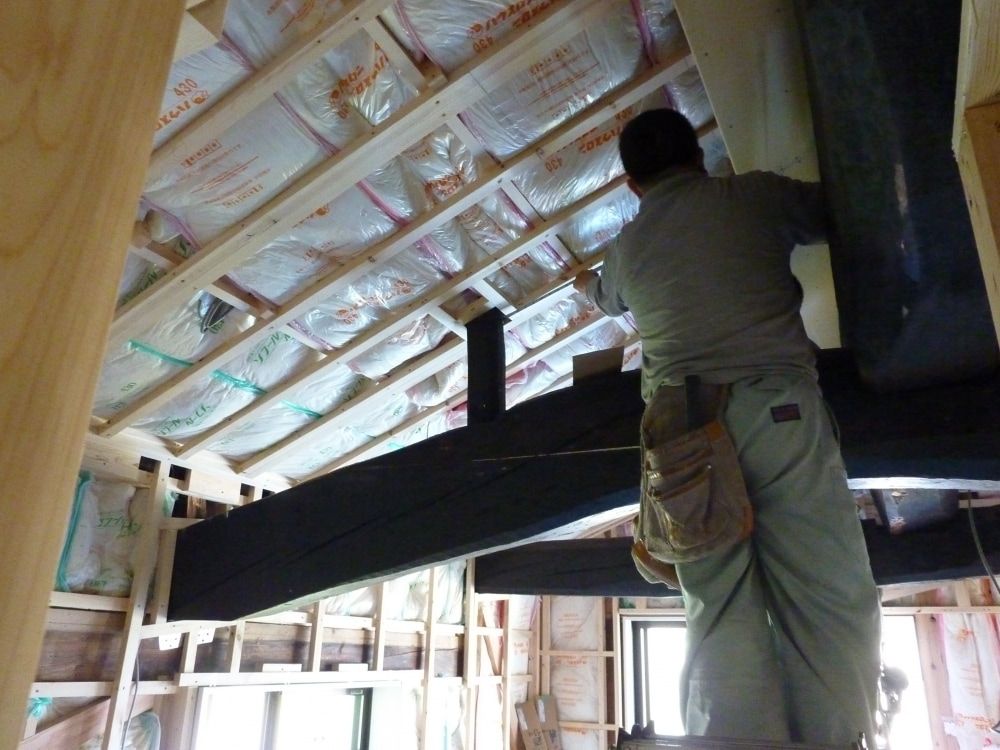 大工さんの工事が順調に進んでいます。断熱性能の高い窓サッシと断熱材+防水シートで外壁部分を囲います。