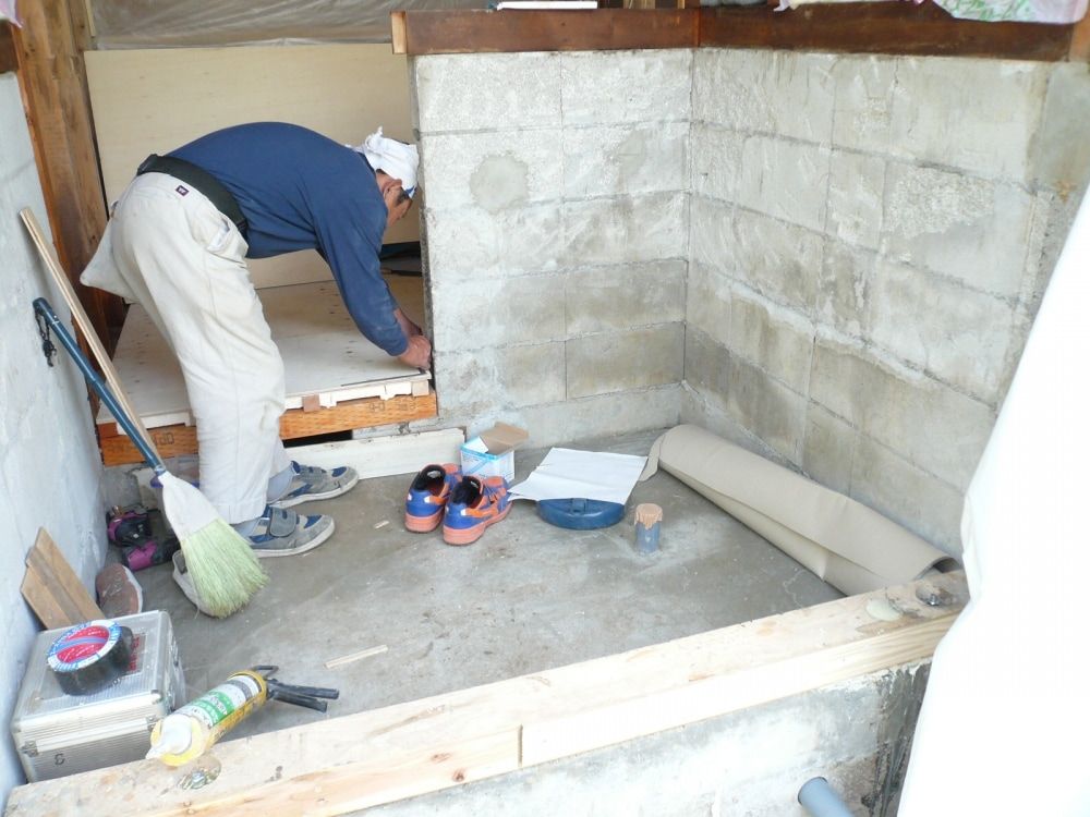 解体工事も終わり、トイレの配管、浴室の土間コンクリートを打設しました。床下調湿材を敷き込み、床断熱材を入れました。大工工事も順調に進んでます。